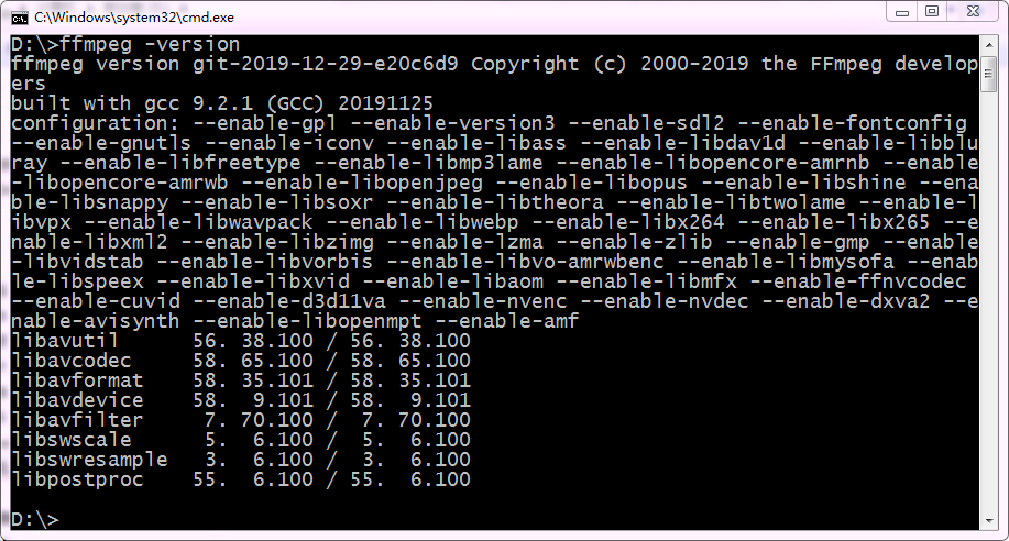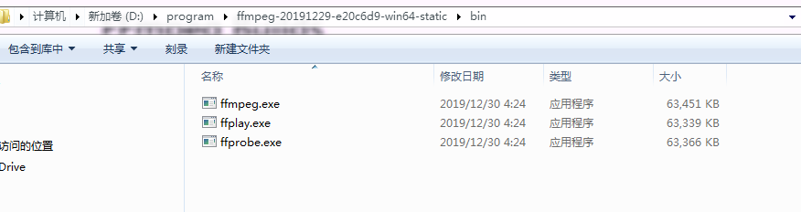 下载 :ffmpeg.zip,并解压,本教程将ffmpeg解压到D:\program\ffmpeg-20191229-e20c6d9-win64-static
