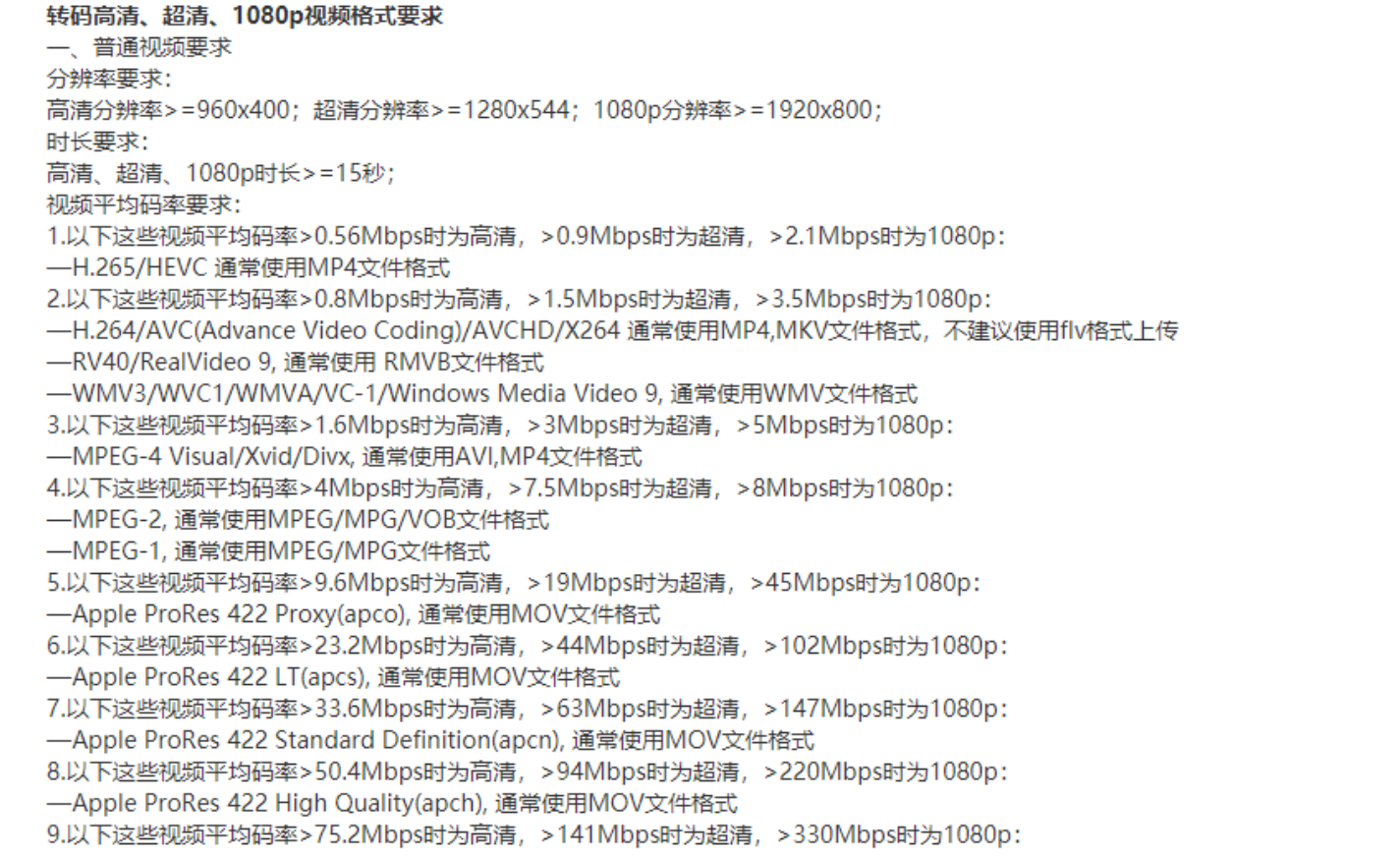 码率设置到多少才能达到最好,通过根据个人的经验或参考一些视频网台给出的参考,下图是优酷对码率的要求: