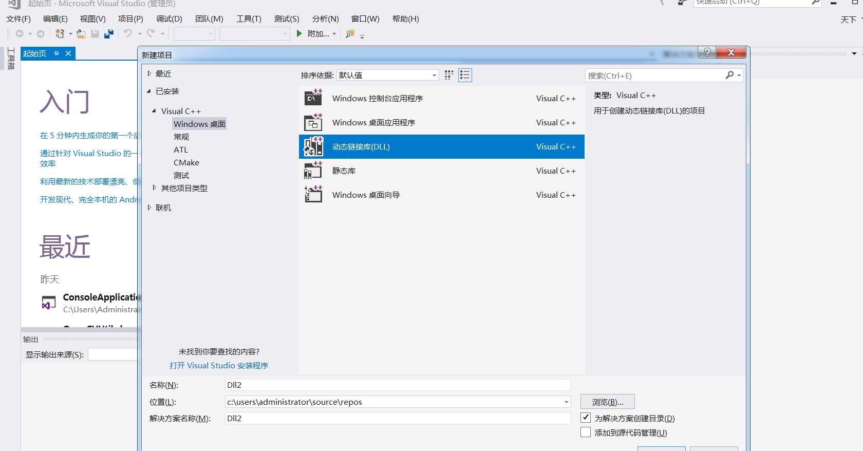 点击 文件-->新建--->项目--->windows桌面-->动态链接库(Dll),这样项目就新建成功,接下来上代码