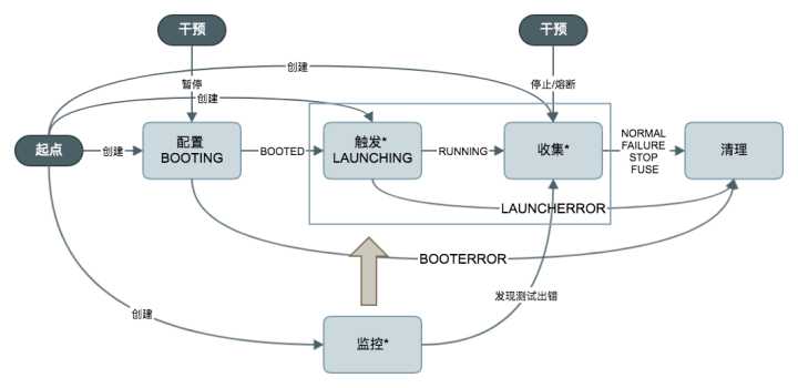 此外,我们还需要鉴别出各种可能的异常情况(如测试触发失败)和合理情况(如用户主动停止),并据此输出不同的反馈信息,并且无论测试流程出现何种分支,最后都能形成闭环,这对系统的健壮性非常重要。以下是状态流转图: