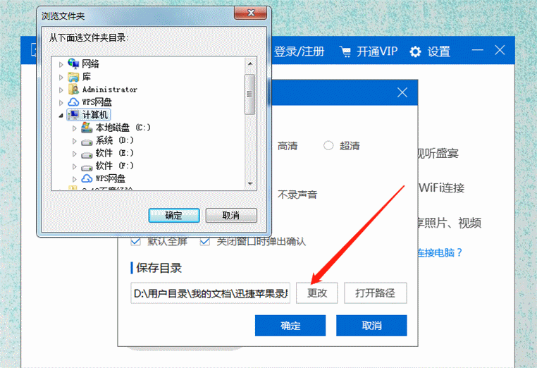6、为了防止录屏文件在C盘中堆积过多导致电脑卡顿,可以点击更改路径设置成别的硬盘之中,例如:D\F盘之中。