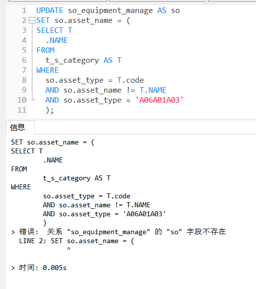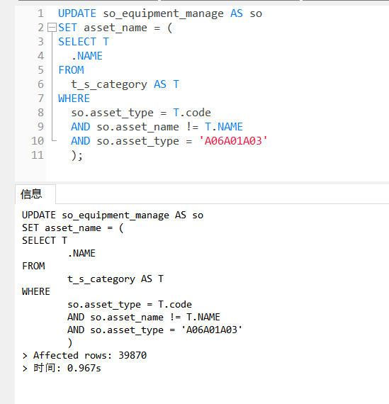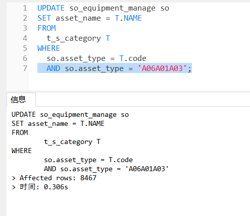并尽量缩小修改范围,我的sql中 asset_type = 'A06A01A03' 这个条件是单独加的,仅仅对这一类数据进行尝试。即使这样,错误的sql 也会使得表内所有数据被修改。】