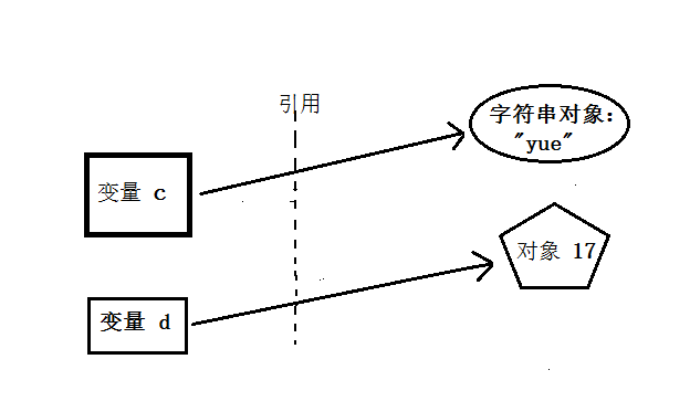 可以看到#1、#2处c、d都还是对象17的引用,当#3处把变量c 指向新对象字符串"yue" 时,#4处发现变量c指向的对象id变了,的确不是17了,所以对象17的引用 -1 如下图 <span class='mark_red'>注意:这儿改变了c的引用,可是#5处d却没有跟着c变,还是对象17</span>