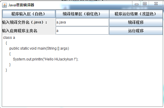 接着在输入编译文件名(.java)后面的文本框里填入与类名相同的.java文件,如a.java,点击编译程序。