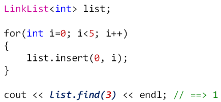 - <font color=blue>int</font> find(<font color=blue>const</font> T& e) <font color=blue>const</font>;