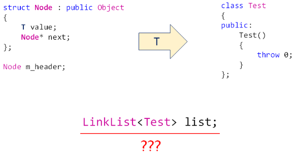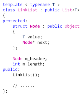 - 通过类模板实现链表,包含<font color=red>头结点成员</font>和<font color=purple>长度成员</font>