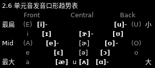 - 元音(母音): 发音时,气流不受阻碍。元音是音节的核心。
