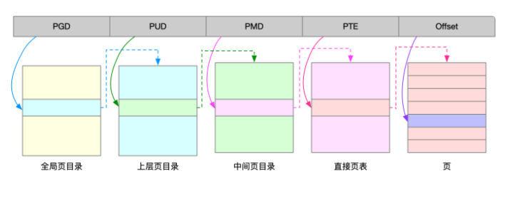 Linux 用的正是四级页表来管理内存页,如下图所示,虚拟地址被分为 5 个部分,前 4 个表项用于选择页,而最后一个索引表示页内偏移。