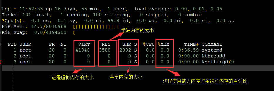 top - 11:52:35 up 16 days, 55 min, 1 user, load average: 0.00, 0.01, 0.05