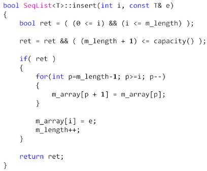 问题: 长度相同的两个<font color=purple>SeqList</font>,<font color=red>插入</font>和<font color=red>删除</font>操作的<font color=red>平均耗时</font>是否相同? (insert操作最耗时的部分是for循环,究竟有多耗时取决于线性表里面存储的数据元素的类型是什么。如果存储的数据元素的类型是一个自定义的类,并且这个类还非常的庞大,那么插入操作就真的非常耗时了,因为涉及了对象之间的拷贝。)
