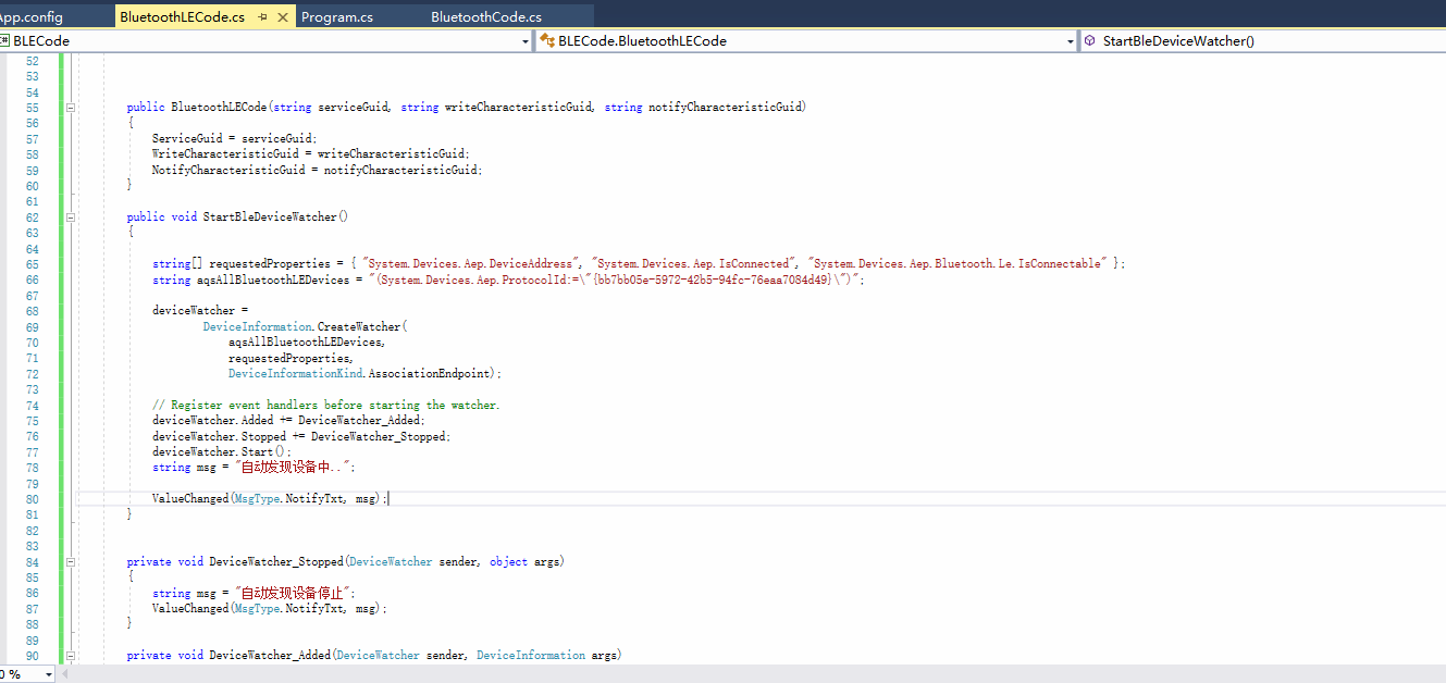 public BluetoothLECode(string serviceGuid, string writeCharacteristicGuid, string notifyCharacteristicGuid)