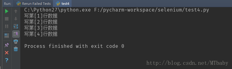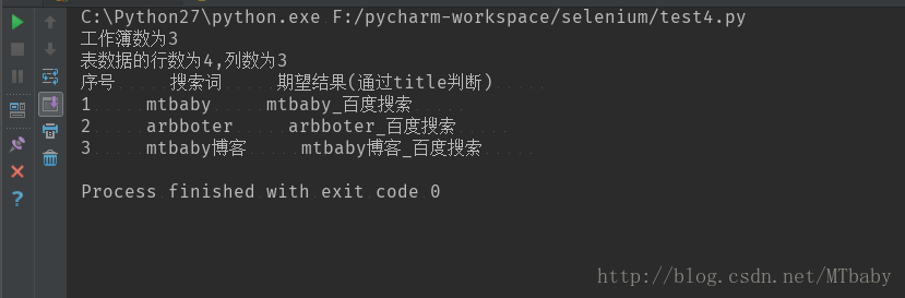 if __name__=="__main__": #excel文件全路径 excelpath = r'F:\pycharm-workspace\selenium\test.xlsx' #用于读取excel文件 tableopen = xlrd.open_workbook(excelpath) #获取excel工作簿数 count = len(tableopen.sheets()) print u"工作簿数为%s"%count #获取表数据的行、列数 table = tableopen.sheet_by_name('Sheet1') h = table.nrows l = table.ncols print u"表数据的行数为%s,列数为%s"%(h,l) # 循环读取数据 for i in range(0,h): rowValues = table.row_values(i) #按行读取数据 # 输出读取的数据 for data in rowValues: print data,' ', print ''