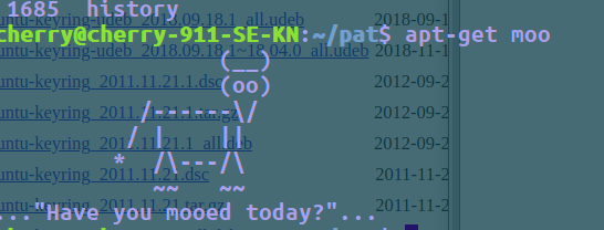 这时我们可以输入apt-get moo来测试一下, 看到我们熟悉的超级牛力就成功了.如图:
