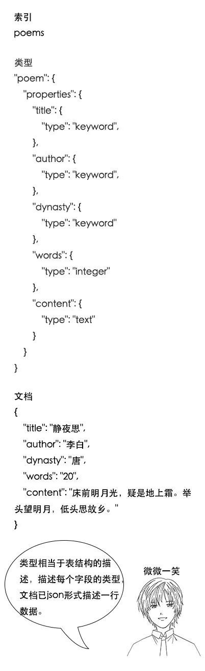 吕老师:比如一首诗,有诗题、作者、朝代、字数、诗内容等字段,那么首先,我们可以建立一个名叫poems的索引,然后创建一个名叫poem的类型,类型是通过mapping来定义每个字段的类型,比如诗题、作者、朝代都是keyword类型,诗内容是text类型,而字数是integer类型,最后就是把数据组织成json格式存放进去了。