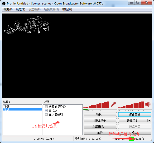 配好后就用推流软件啦,我用的是OBS,按照OBS操作就可以 啦!