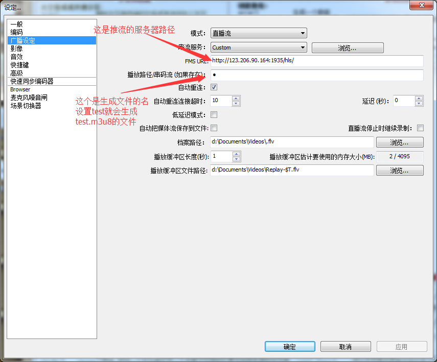 在设置->串流 中填写信息:URL为 rtmp://xxx:1935/hls,xxx为你的服务器的IP地址,hls是用来存放流媒体的。