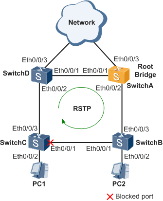 网络规划者规划好网络后,可以在网络中部署RSTP协议预防环路。当网络中存在环路,RSTP通过阻塞某个端口以达到破除环路的目的。如图8-5所示,当前网络中存在环路,SwitchA、SwitchB、SwitchC和SwitchD都运行RSTP,通过彼此交互信息发现网络中的环路,并有选择的对某个端口进行阻塞,最终将环形网络结构修剪成无环路的树形网络结构,从而防止报文在环形网络中不断循环,避免设备由于重复接收相同的报文造成处理能力下降。