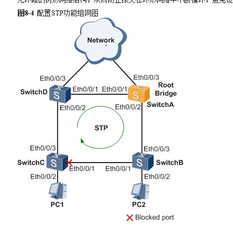 在一个复杂的网络中,网络规划者由于冗余备份的需要,一般都倾向于在设备之间部署多条物理链路,其中一条作主用链路,其他链路作备份。这样就难免会形成环形网络,若网络中存在环路,可能会引起广播风暴和MAC表项被破坏。网络规划者规划好网络后,可以在网络中部署STP协议预防环路。当网络中存在环路,STP通过阻塞某个端口以达到破除环路的目的。如图8-4所示,当前网络中存在环路,SwitchA、SwitchB、SwitchC和SwitchD都运行STP,通过彼此交互信息发现网络中的环路,并有选择的对某个端口进行阻塞,最终将环形网络结构修剪成无环路的树形网络结构,从而防止报文在环形网络中不断循环,避免设备由于重复接收相同的报文造成处理能力下降。