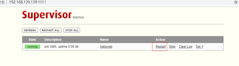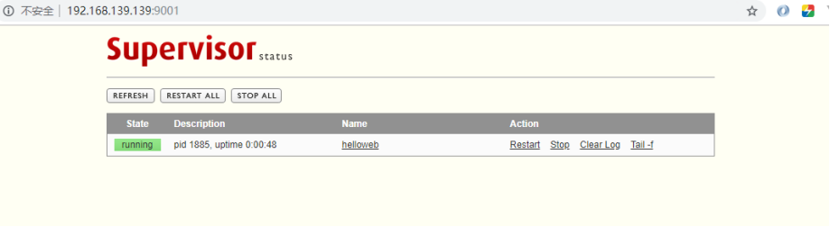 出现绿色的“running”表示成功,名称“helloweb”就是刚刚的helloweb.ini配置中的[program:helloweb] 的program:后面定义的名称