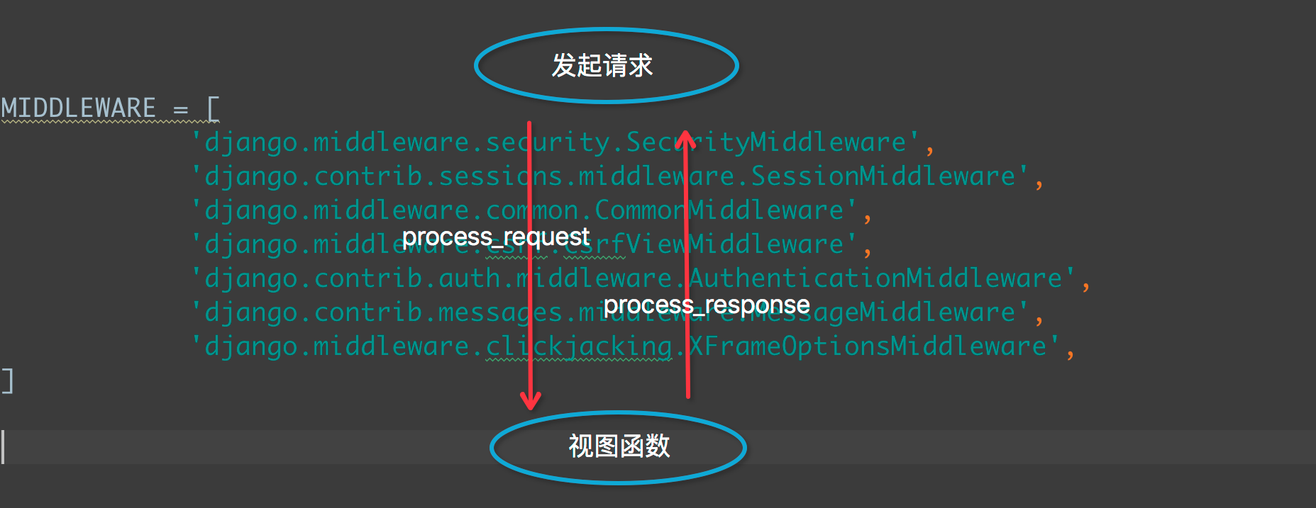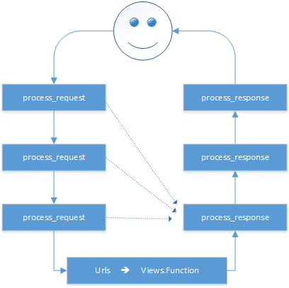 当用户发起请求的时候会依次经过所有的的中间件,这个时候的请求时process_request,最后到达views的函数中,views函数处理后,在依次穿过中间件,这个时候是process_response,最后返回给请求者。