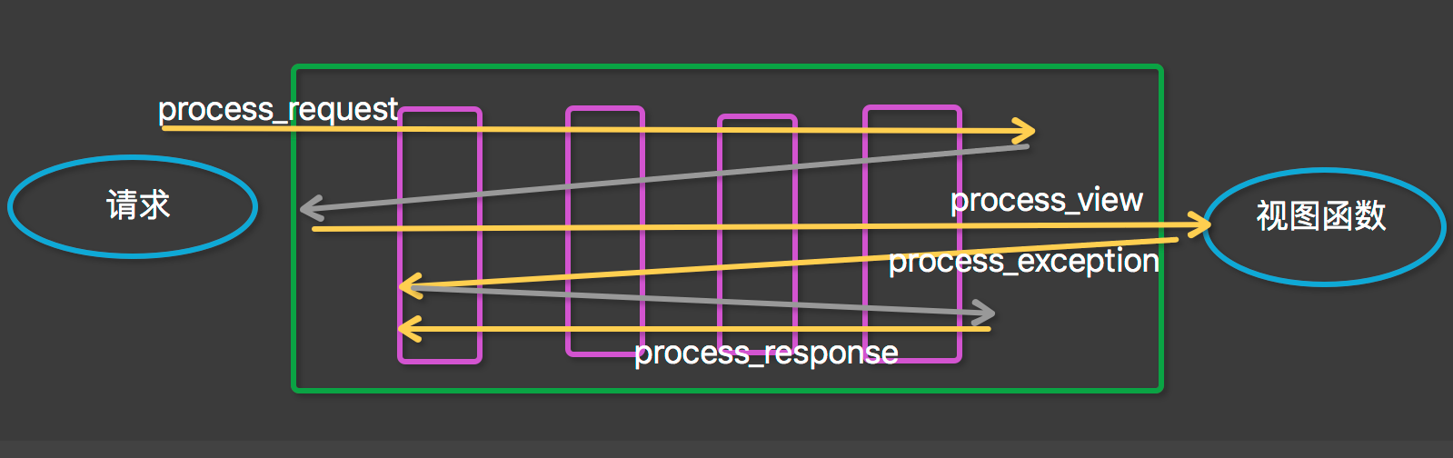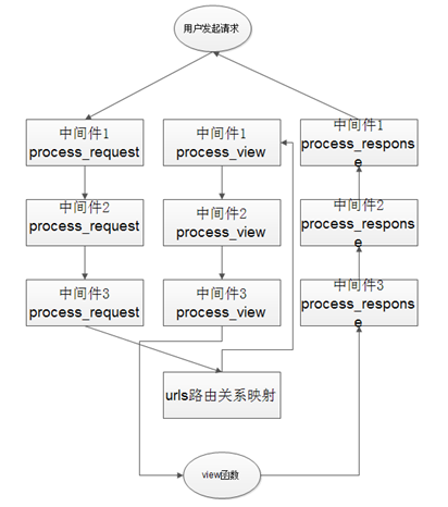 当最后一个中间的process_request到达路由关系映射之后,返回到中间件1的process_view,然后依次往下,到达views函数,最后通过process_response依次返回到达用户。
