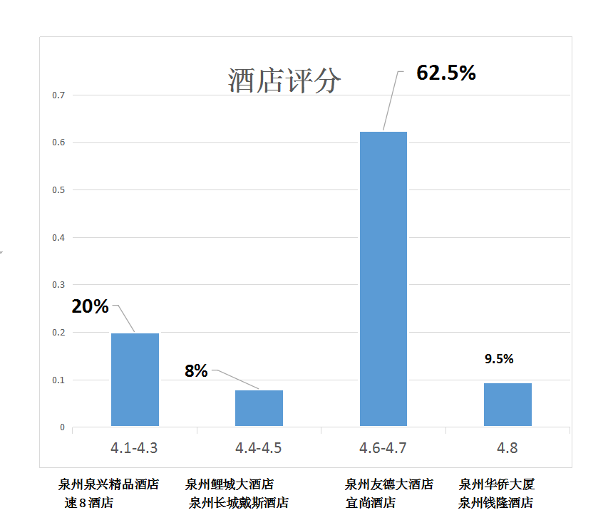 通过对泉州地区酒店的爬取,可以知道每个酒店的具体名称和地址还有酒店评分,由此可知泉州华侨大厦和希岸酒店,泉州钱隆酒店的评分最高;泉州泉兴精品酒店评分最低。