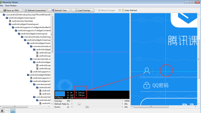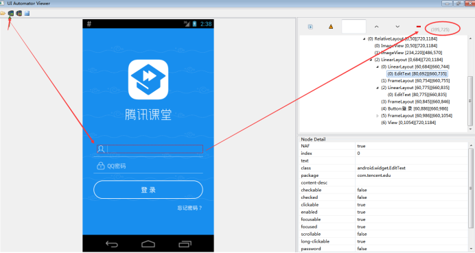 ---->在android sdk路径-tools下,使用sdk中的工具hierarchyviewer.bat或者uiautomatorviewer.bat,获取API方法中控件位置(X,Y轴的坐标)。