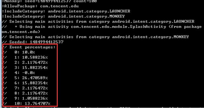 3.执行monkey测试命令:adb shell monkey -p com.tencent.edu -v -v 200