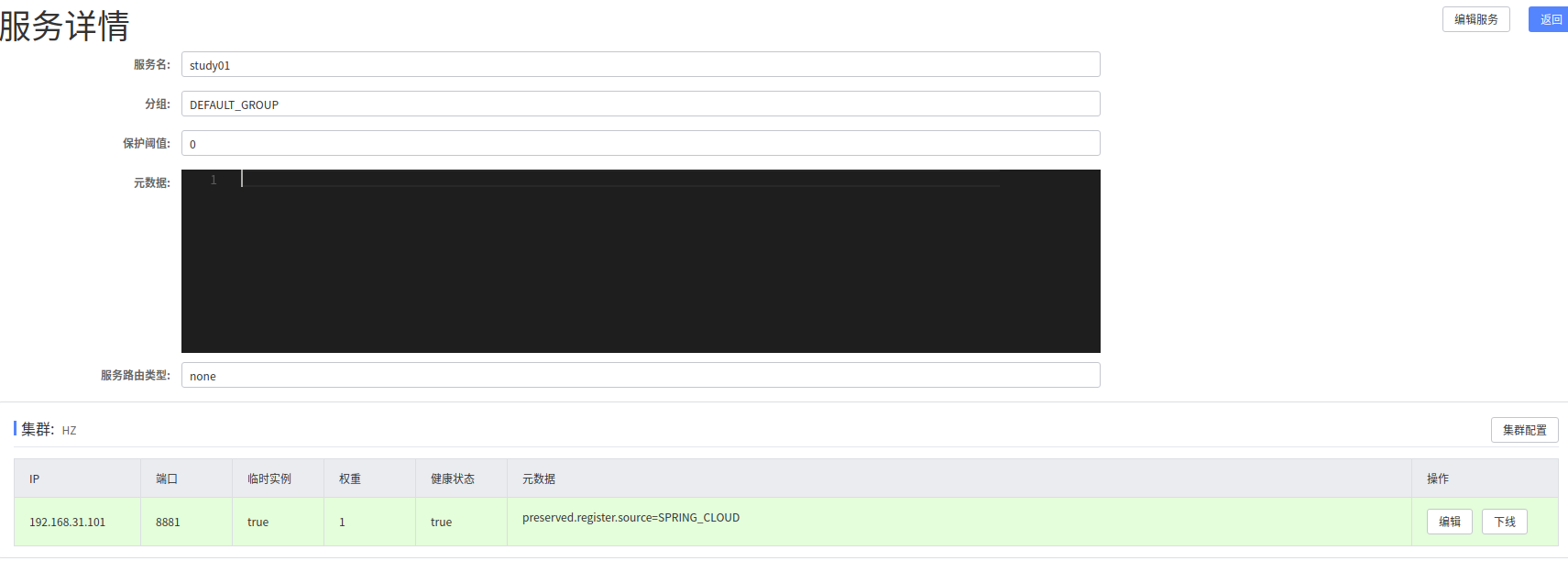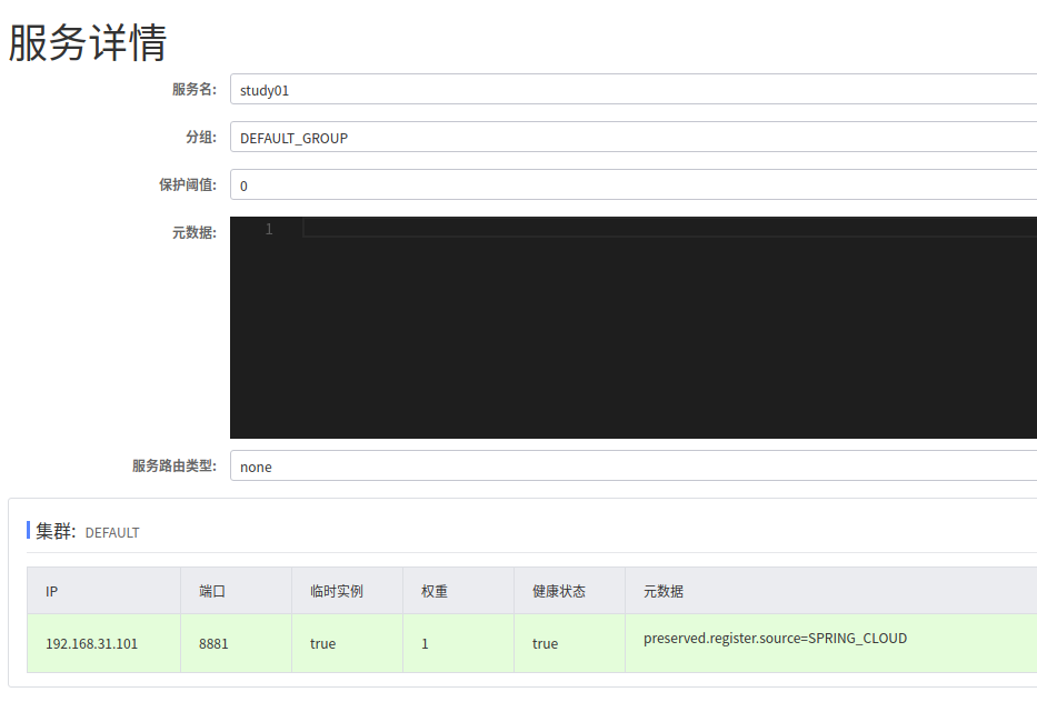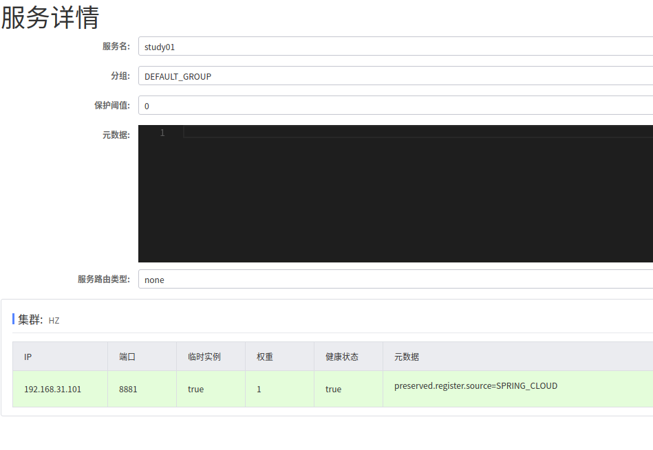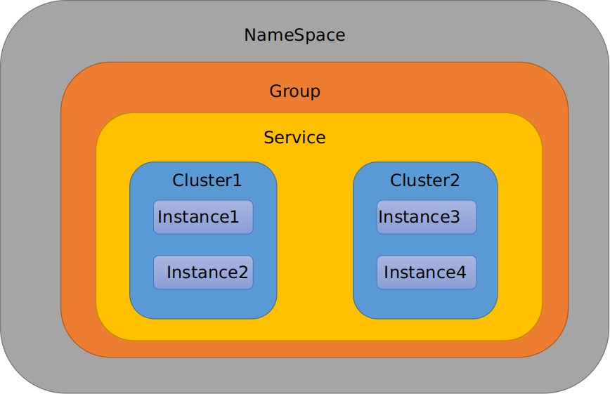 Group之下是Service,就是我们所谓的微服务;一个Service可以包含多个Cluster(集群),Nacos默认Cluster是DEFAULT,Cluster是对指定微服务的一个虚拟划分,比方说为了容灾,将Service微服务分别部署在了杭州机房和广州机房,这时就可以给杭州机房的Service微服务起一个集群名称(HZ),给广州机房的Service微服务起一个集群名称(GZ),还可以尽量让同一个机房的微服务互相调用,以提升性能。最后是Instance,就是微服务的示例。