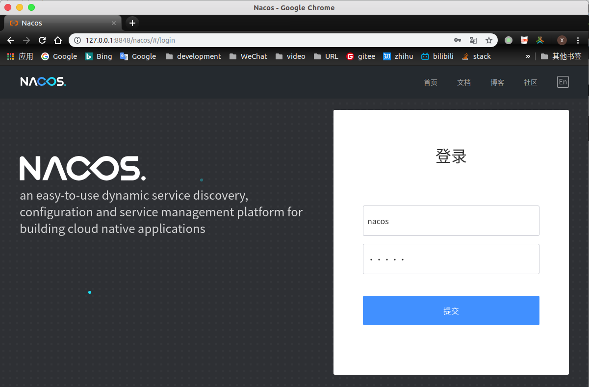 打开浏览器输入:http://127.0.0.1:8848/nacos,进入nacos可视化控制页面,账号密码默认nacos。