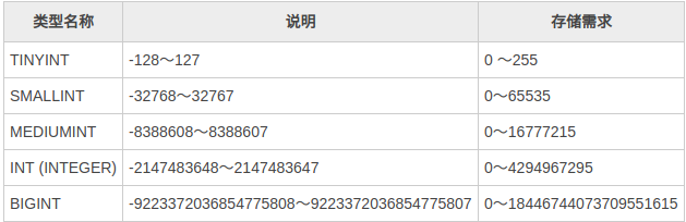 MySQL主要提供的整型有:TINYINT、SMALLINT、MEDIUMINT、INT、BIGINT。不同的整数类型支持的取值范围不同,需要的存储空间也不同。使用时根据需求选择合适的类型,节省存储空间提高查询的效率。