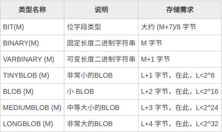 ###二进制类型 MySQL中的二进制字符串有: BIT、BINARY、VARBINARY、TINYBLOB、BLOB、MEDIUMBLOB 和 LONGBLOB。