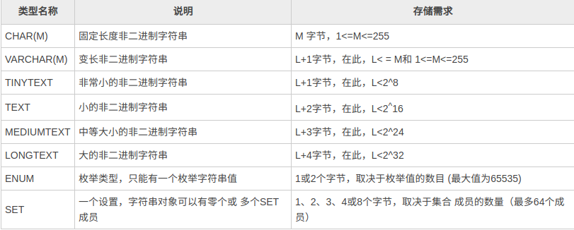 MySQL 中的字符串类型有 CHAR、VARCHAR、TINYTEXT、TEXT、MEDIUMTEXT、LONGTEXT、ENUM、SET 等。