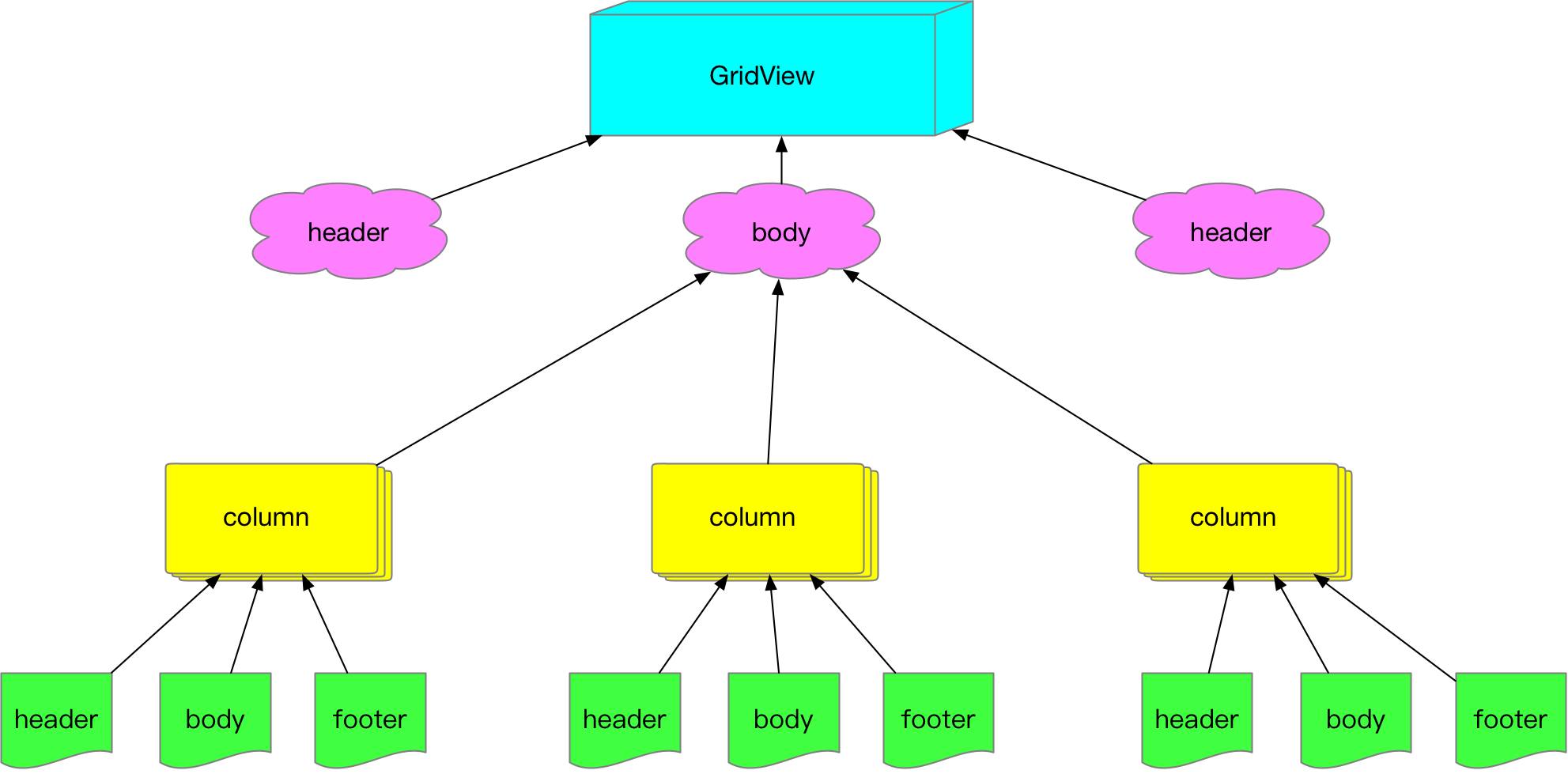 简单的说,一个GridView由N个column(列)组成,而每个列里有自己的header、content和footer操作,这在GridView的代码中有所体现