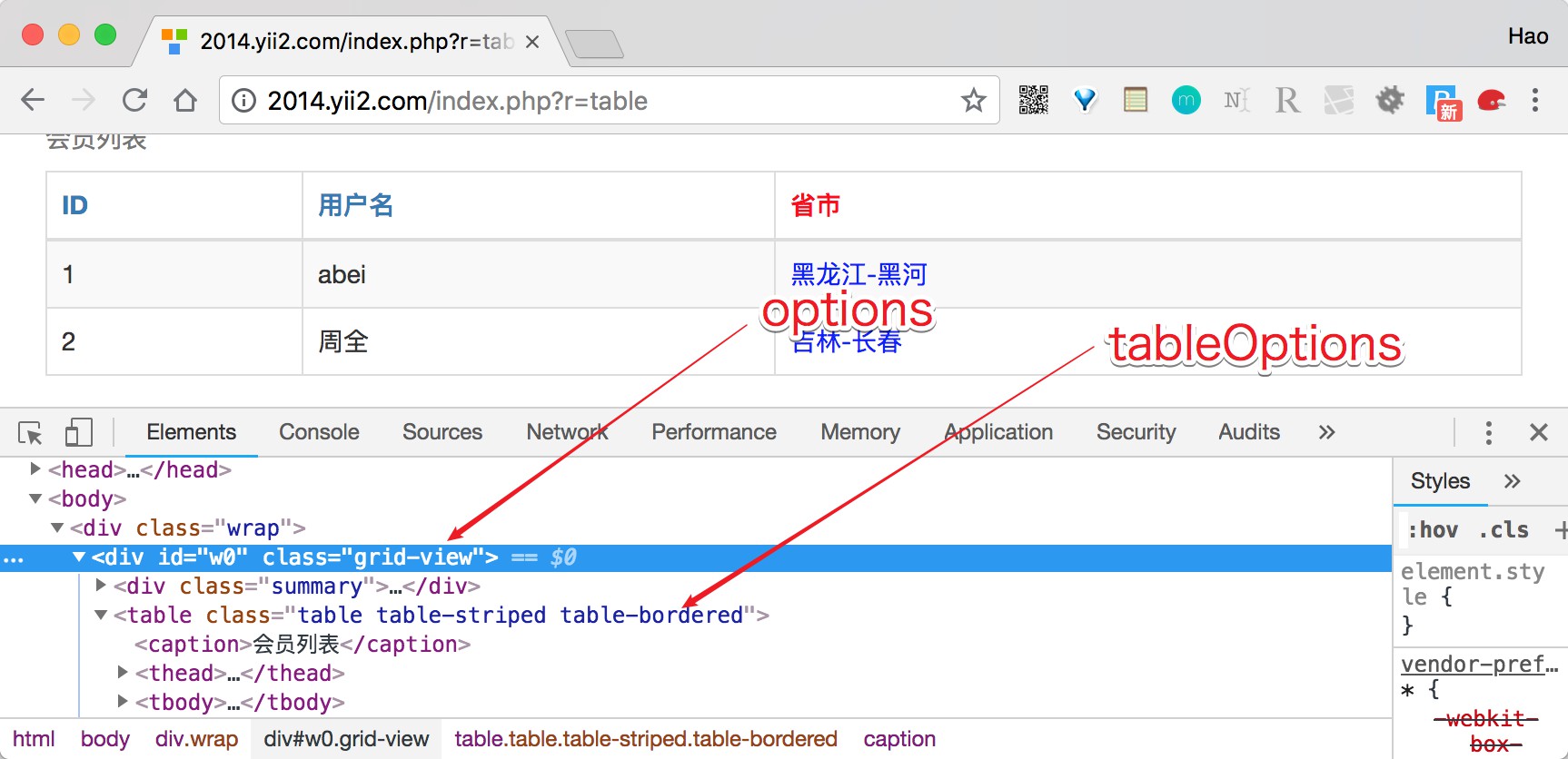 - tableOptions 控制着{items}表格的属性,默认为其添加一个 class="table table-striped table-bordered"