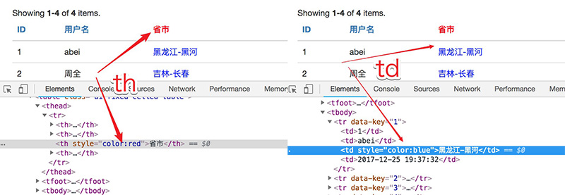 现在我们来做一个需求,将省市这一列个性化,列的头部编程红色,列的内容编程蓝色,如下