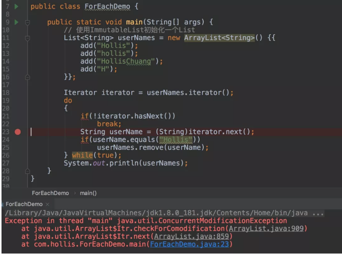以上代码,使用增强for循环遍历元素,并尝试删除其中的Hollis字符串元素。运行以上代码,会抛出以下异常: