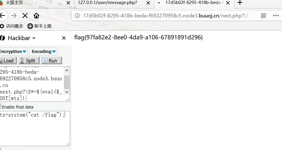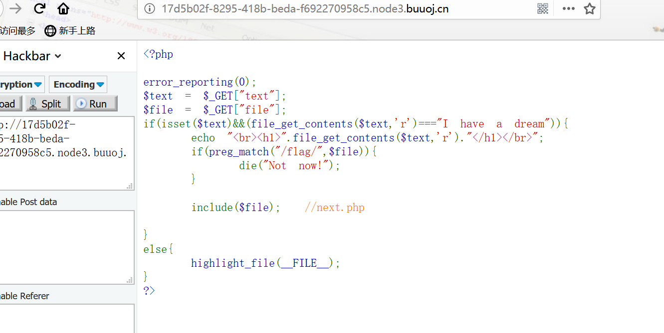 一开始还想用正则贪婪模式匹配绕过。后来发现就是伪协议。。 直接传参读取next.php源码: