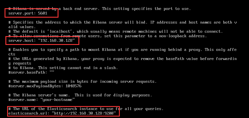 设置端口号:5601,Host地址:"192.168.30.128" ,elasticsearch服务地址为:"http://192.168.30.128:9200"