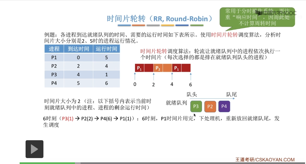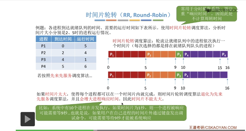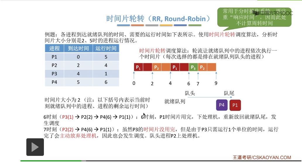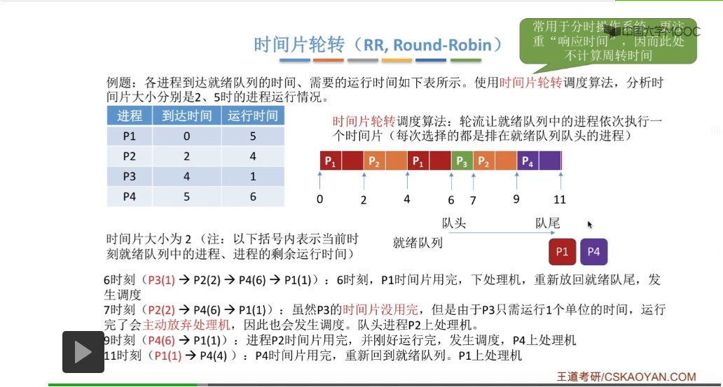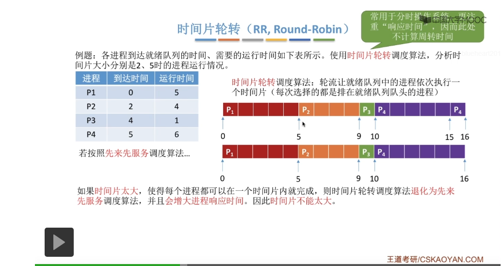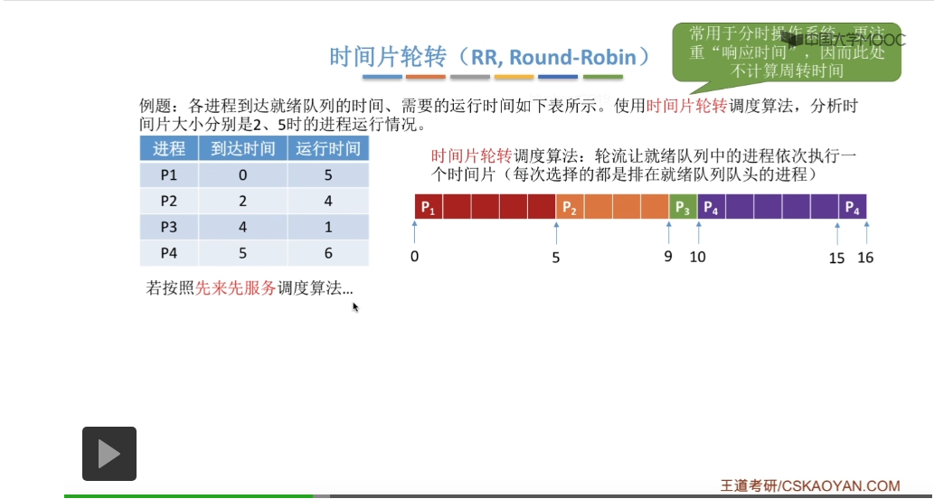 时间片轮转调度算法它一般是用于分时操作系统的,比起之前所说的那些平均周转时间来说,这种类型的操作系统会更关心进程的响应时间,所以在这个地方我们也不再计算进程的等待时间、周转时间那些指标。