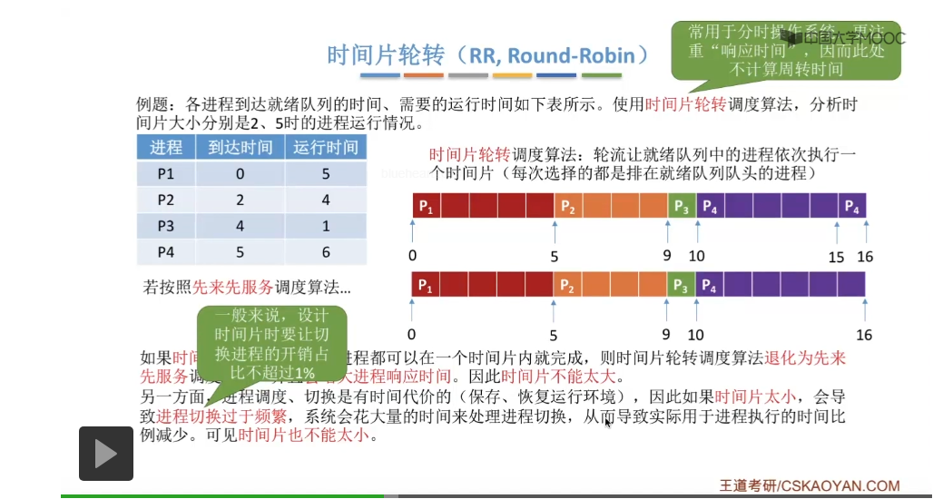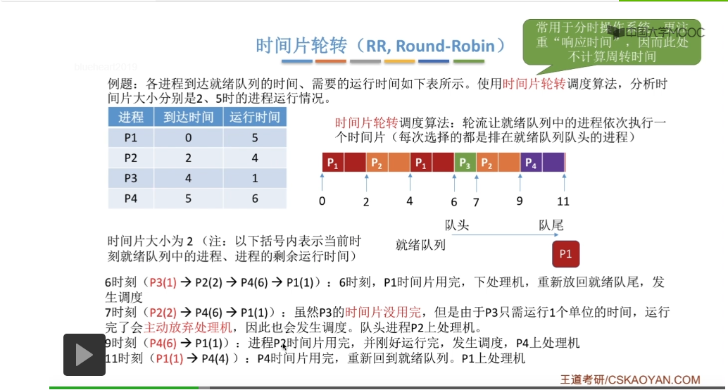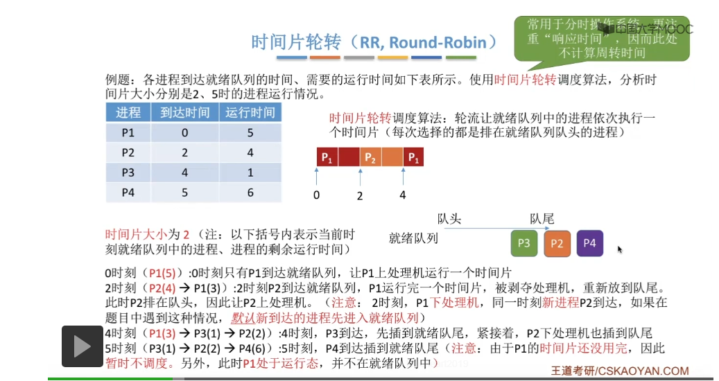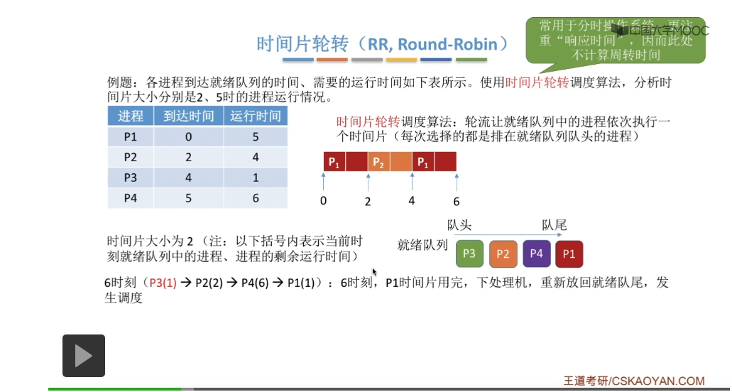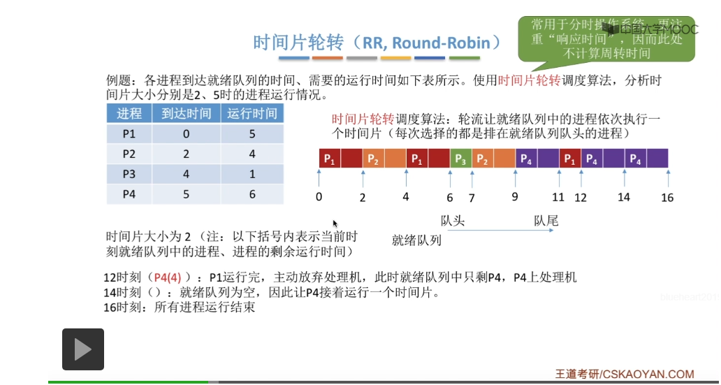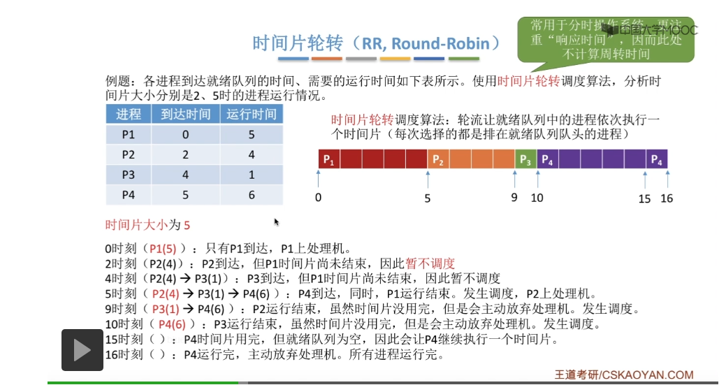 时间片轮转调度算法它一般是用于分时操作系统的,比起之前所说的那些平均周转时间来说,这种类型的操作系统会更关心进程的响应时间,所以在这个地方我们也不再计算进程的等待时间、周转时间那些指标。