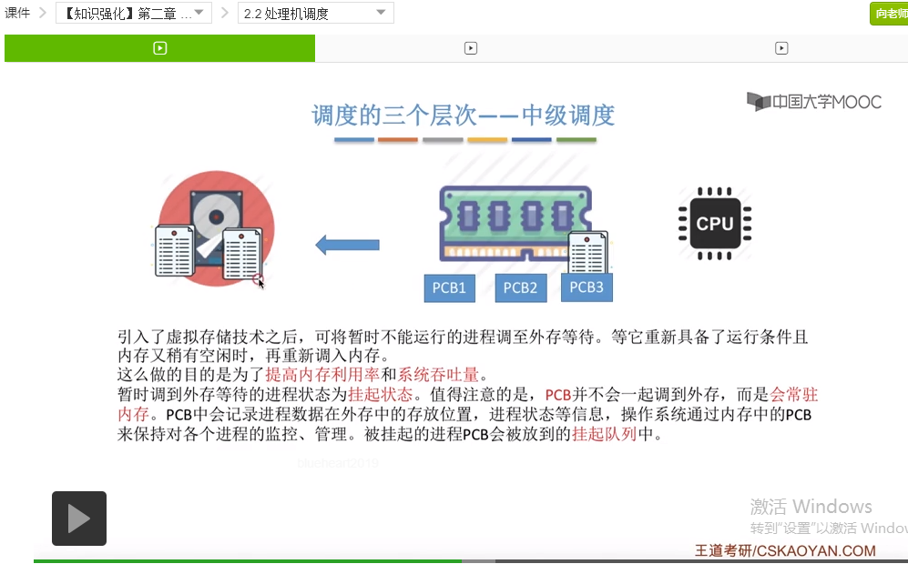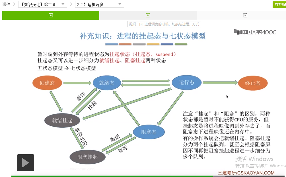 和几个调度的层次,分别为高级调度、中级调度和低级调度。其中由中级调度,也就是内存调度我们会引出一个、补充一个课本上没有太多提及的知识点,就是进程的挂起态,并且会介绍一个进程状态的七状态模型,之后我们还会介绍三个调度层次的联系和对比。