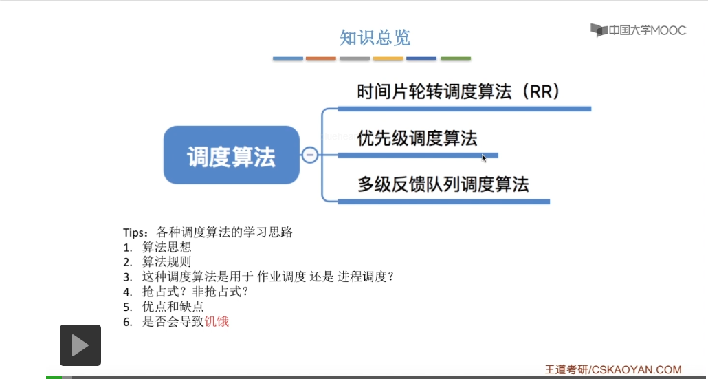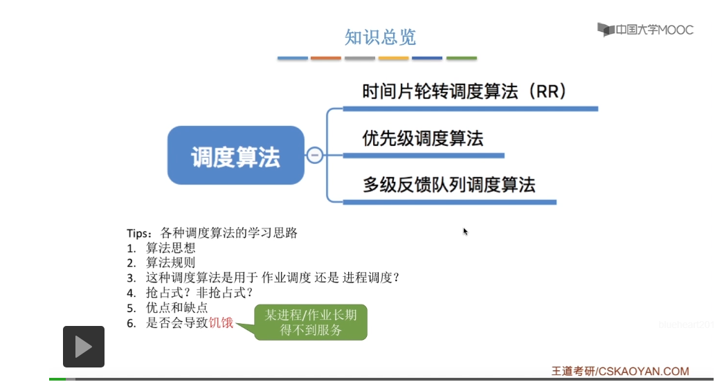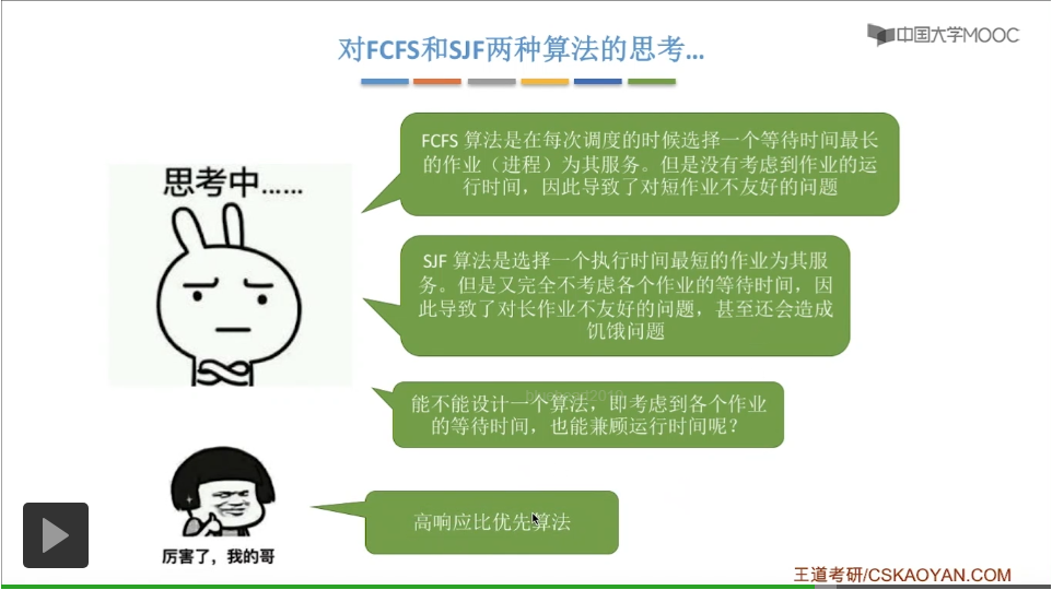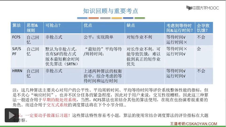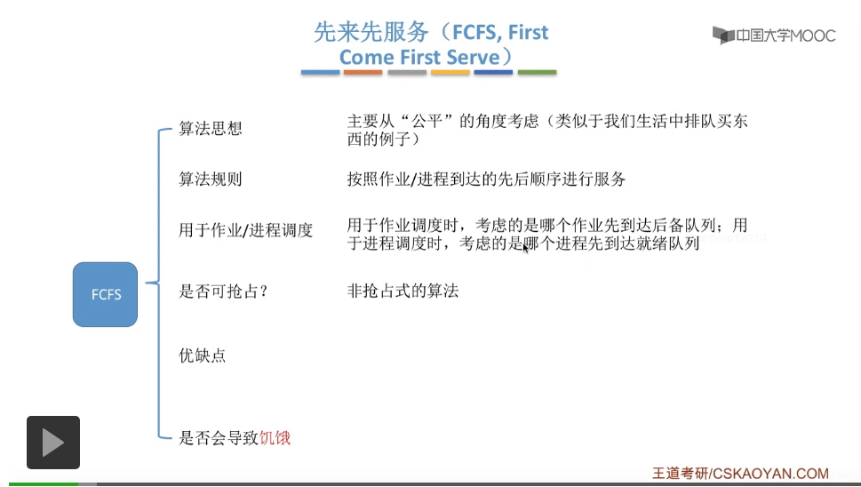 先来先服务它要求绝对的公平,另外呢这三种算法还追求平均等待时间、平均周转时间这些,这些其实都是用来评价系统的整体性能和整体表现的指标。这三种算法的交互性很糟糕,主要用于早期的批处理系统当中。在早期的批处理阶段计算机也很昂贵,所以人们更追求系统的整体表现而不是对于各个用户来说的一种用户体验。先来先服务算法现在也经常结合其他算法一起使用,所以先来先服务算法在现代计算机当中也扮演着很重要的角色。