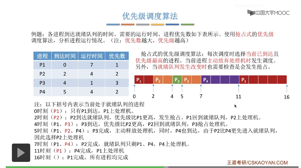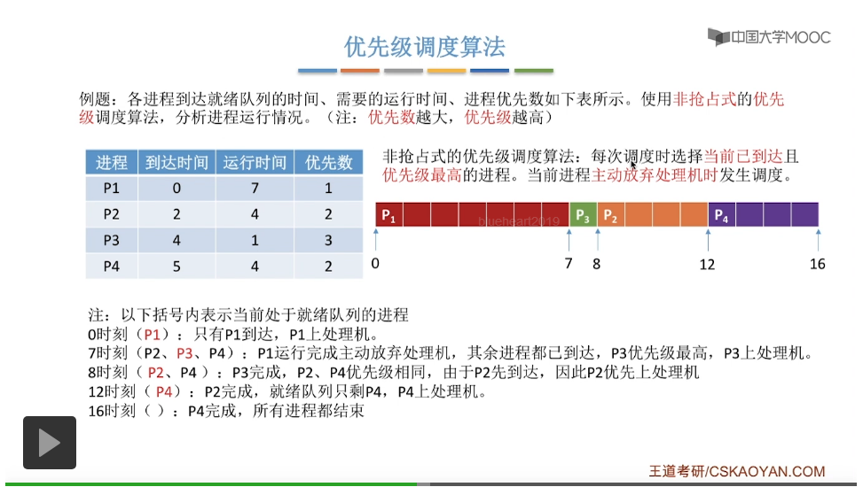 优先数越大,优先级越高。优先数和优先级的概念并不一样,有的题目当中有可能是优先数越小,优先级越高,所以具体要看题目给出的信息和条件。既然采用的是非抢占式的优先级调度算法,我们只需要关注各个进程主动放弃处理机的时候的时刻就可以了。这就是非抢占式的优先级调度算法。