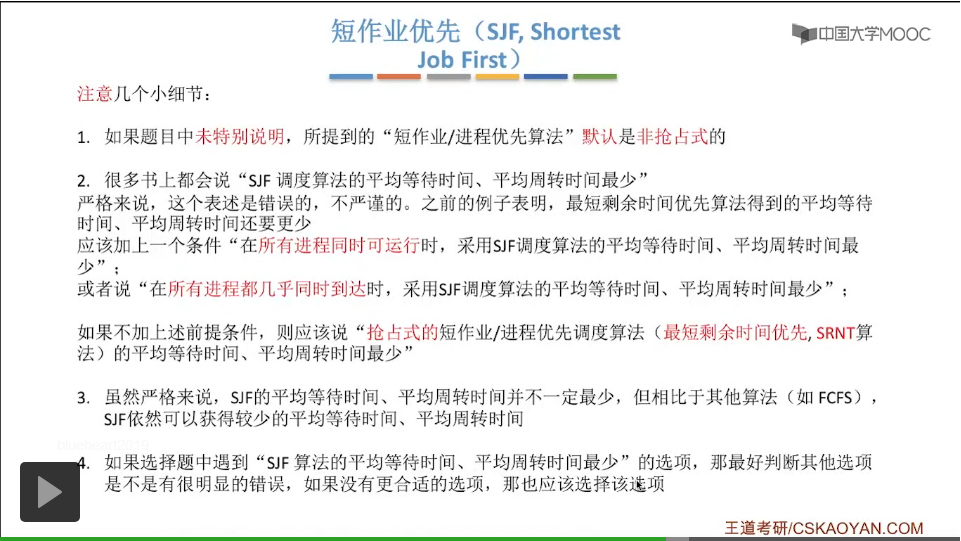 除了要了解抢占式的短作业优先算法(最短剩余时间优先算法)和非抢占式的短作业优先算法在具体的做题过程当中有什么区别之外,我们还需要注意几个小细节。如果未特别说明,短作业优先调度算法默认是指非抢占式的短作业优先调度算法。其实最短剩余时间优先算法所得到的平均等待时间和平均周转时间还要更少。在所有的进程同时可运行的时候,采用短作业优先调度算法(非抢占式的短作业优先调度算法)所得到的平均时间或者平均周转时间是最少的。或者我们还可以改一种说法,如果说所有的进程几乎都是同时到达的,那么采用这种短作业优先调度算法得到的平均等待时间和平均周转时间是最少的。为什么要用一个几乎?因为进程的到达肯定还是有先后顺序的。只不过在宏观上看我们可以认为就是连续到达的那些、很快速的到达的那些进程几乎是同时到达的。然而它们事实上也会有先后顺序,只不过是微观上看有先后顺序,宏观上看这些进程几乎同时到达。还有另外一种说法,如果说我们不要这个“所有的进程几乎都同时到达”这个条件的话,我们可以说抢占式的、就是刚才所提到的那个最短剩余时间优先这个算法所得到的平均等待时间和平均周转时间是最少的,这个是没有问题的。数学基础好的同学可以证明一下为什么这个最短剩余时间优先算法的平均等待时间、平均周转时间最少。虽然短作业优先算法它的平均等待时间、平均周转时间不一定是最少的,但是相比于像先来先服务还有最高响应比优先,相比于这样的算法来说,短作业优先算法仍然可以获得比较少的平均等待时间、平均周转时间这两个指标的。计算机学科和数学、物理这些基础理学的学科不太一样,它并没有一个很严格的说法。在考试的时候,最好就是判断一下所有的选项然后选一个错误更少的、更合适的选项。
