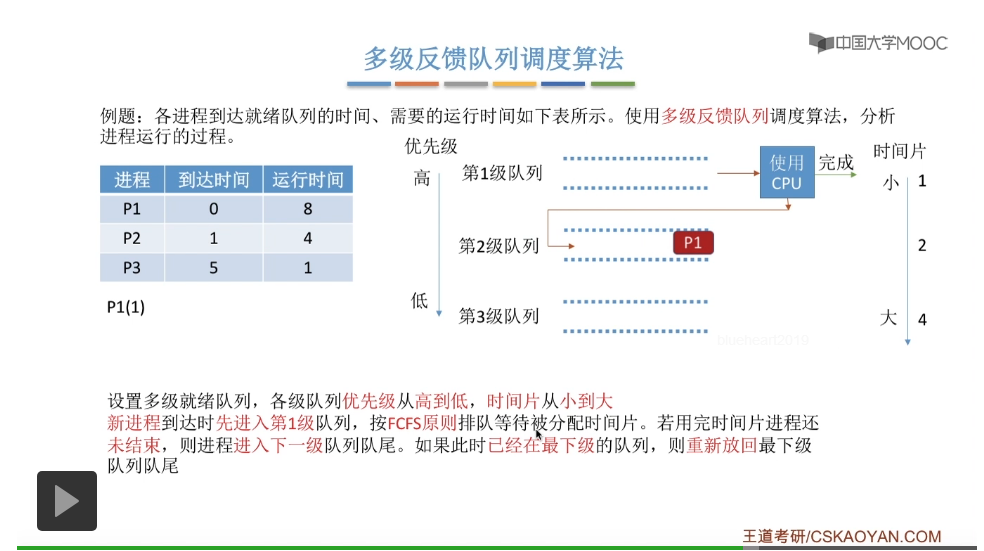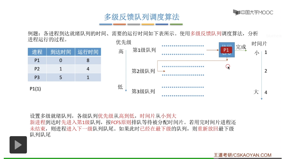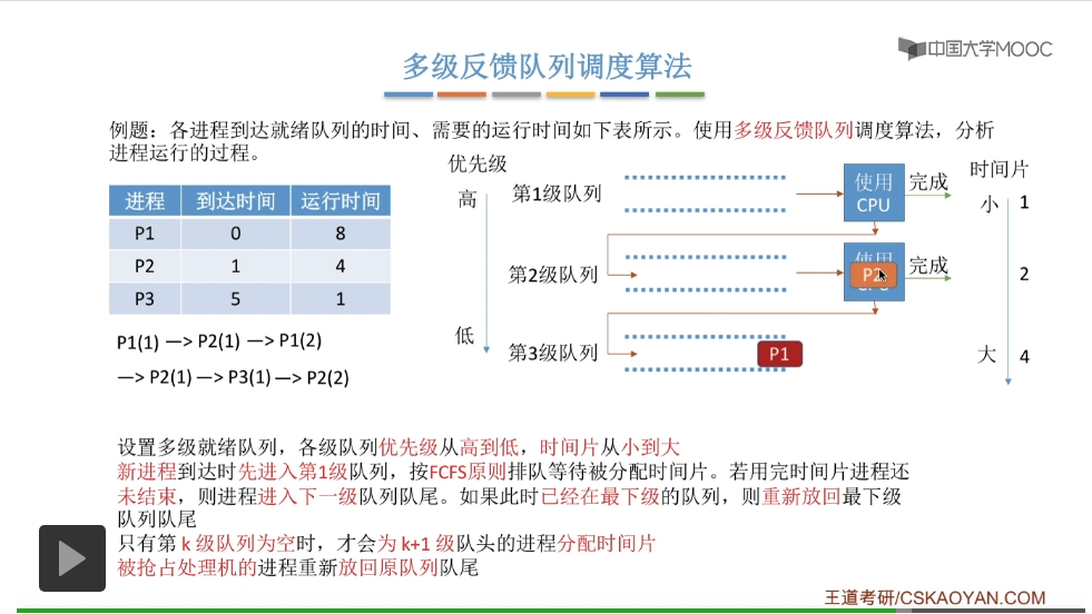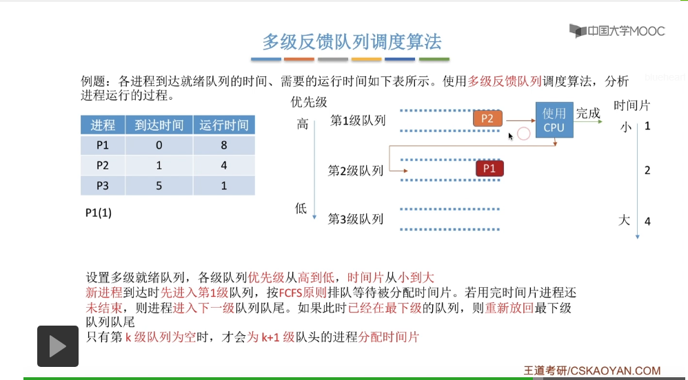 但是第一级队列的时间片大小只有一个单位的时间,所以当P1执行了一个单位的时间片之后,它的时间片就用完了。那么它在用完时间片之后还没