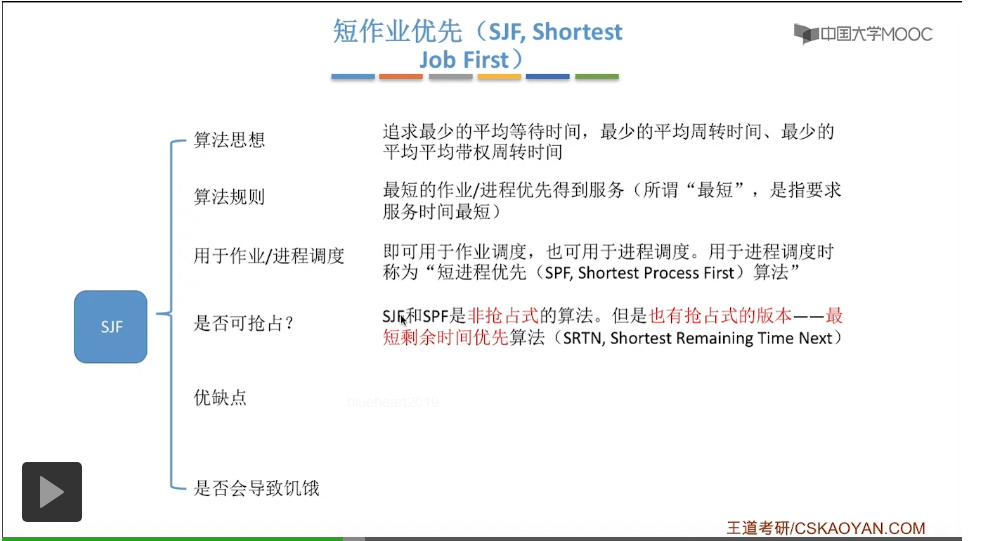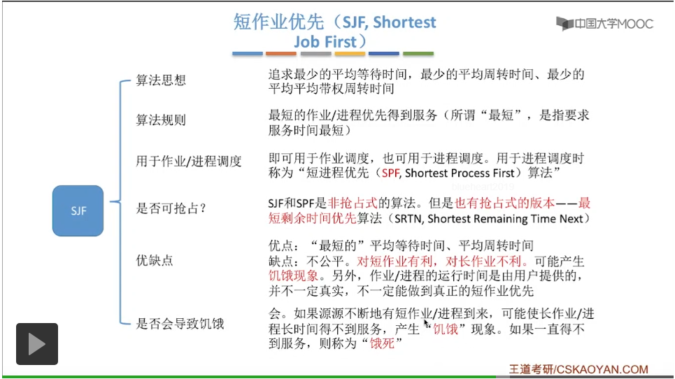 短作业优先调度算法它的优点就是可以得到最短的平均等待时间和平均周转时间。这个“最短”是有双引号的,短作业优先调度算法可以得到最短的平均等待时间和平均周转时间是有一定条件的和一定适用范围的,你知道这句话不严谨这样一个细节就可以了。缺点其实也很明显,就是对于短作业有利,长作业不利。如果说这个就绪队列中源源不断的有更短的作业到来的话,那么就有可能会产生长作业饥饿的现象。作业/进程的运行时间其实是由用户提供的一个数据,所以用户可以把自己本来是长作业但是把自己提交的这个数据把它写的很短,所以事实上短作业优先这种算法并不一定真正的能够做到短作业优先这件事。是会导致饥饿的,更加严重的饥饿现象就可以称做进程饿死或者作业饿死,这就是短作业优先算法。