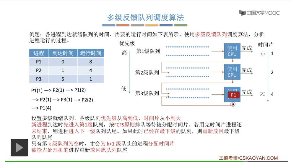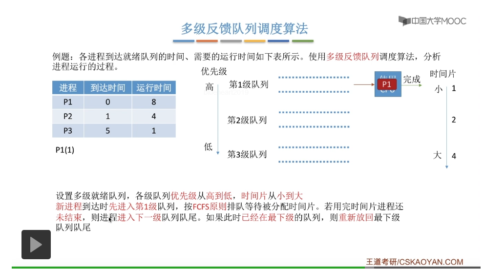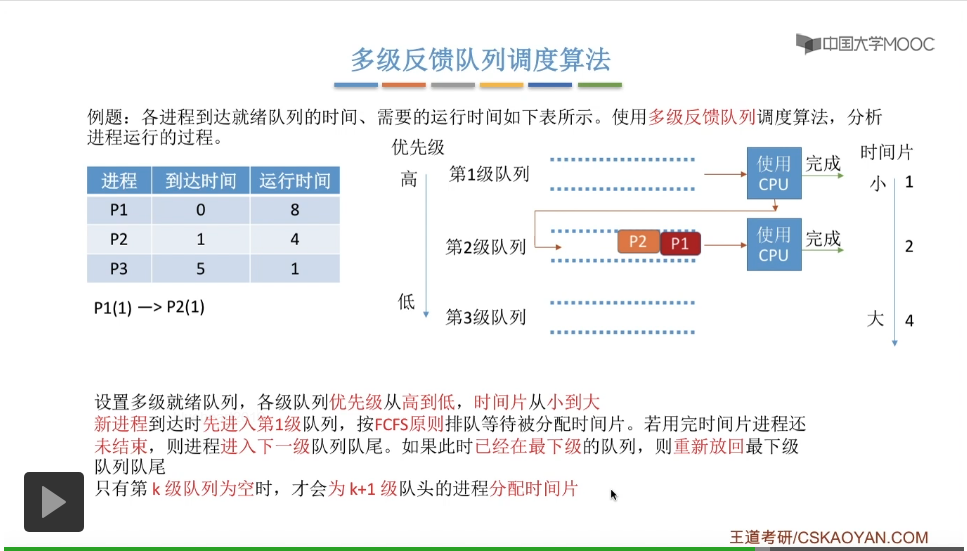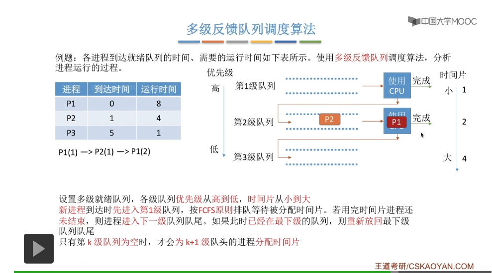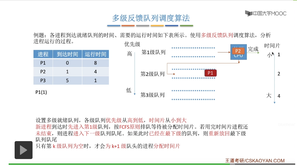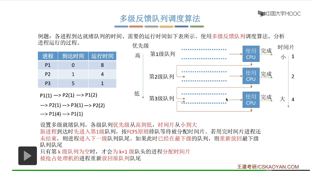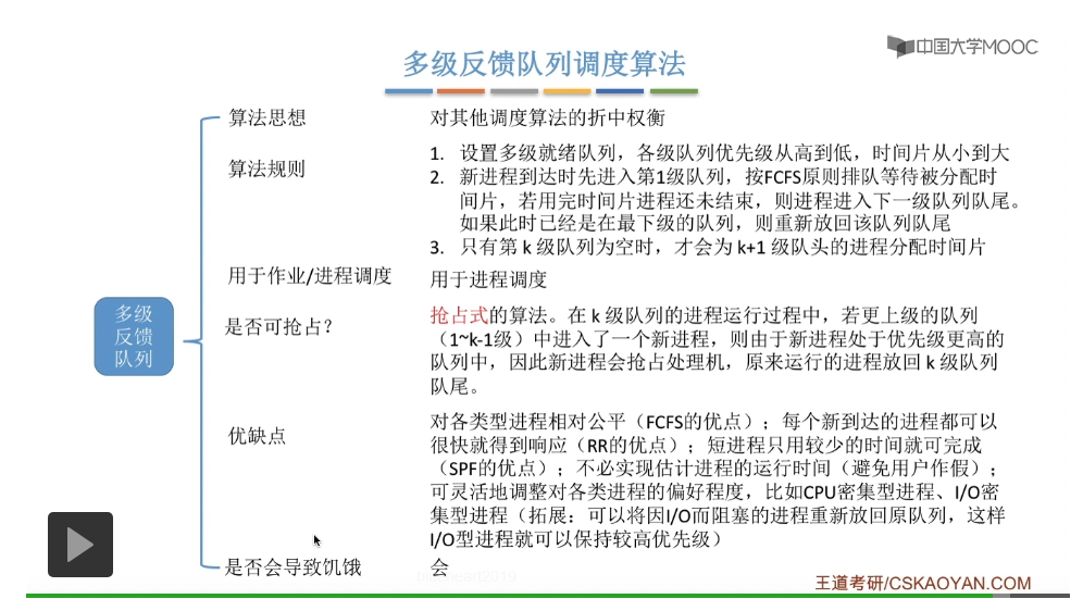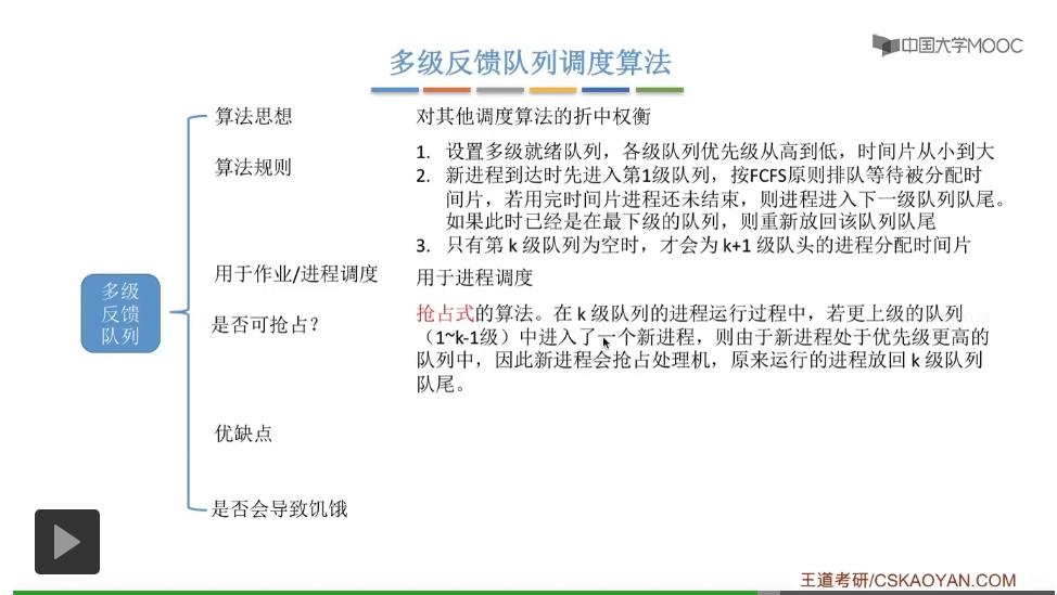 多级反馈队列调度算法的规则比较复杂,一般是用于进程调度的。多级反馈队列调度算法的抢占规则也比较复杂,虽然说它是一种抢占式的算法,但是在实际的操作系统应用当中也有可能是把它实现为非抢占式的版本。但是考试的时候咱们就以汤子赢的教材为准,认为它是抢占式的算法,并且注意一下它在抢占的时候会发生什么事情。