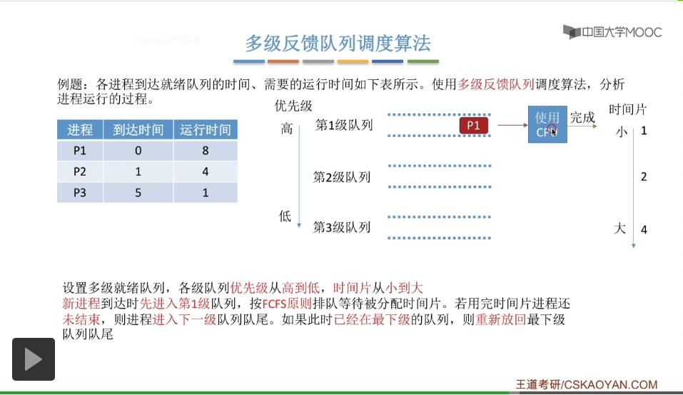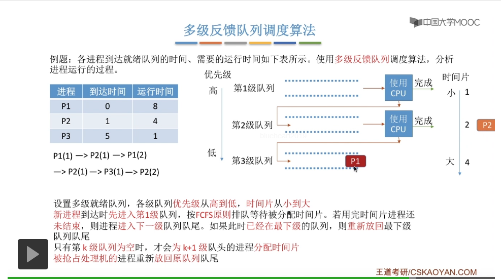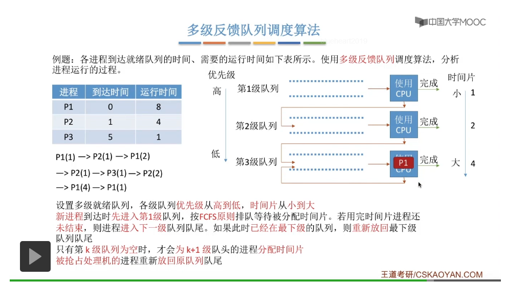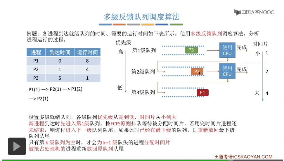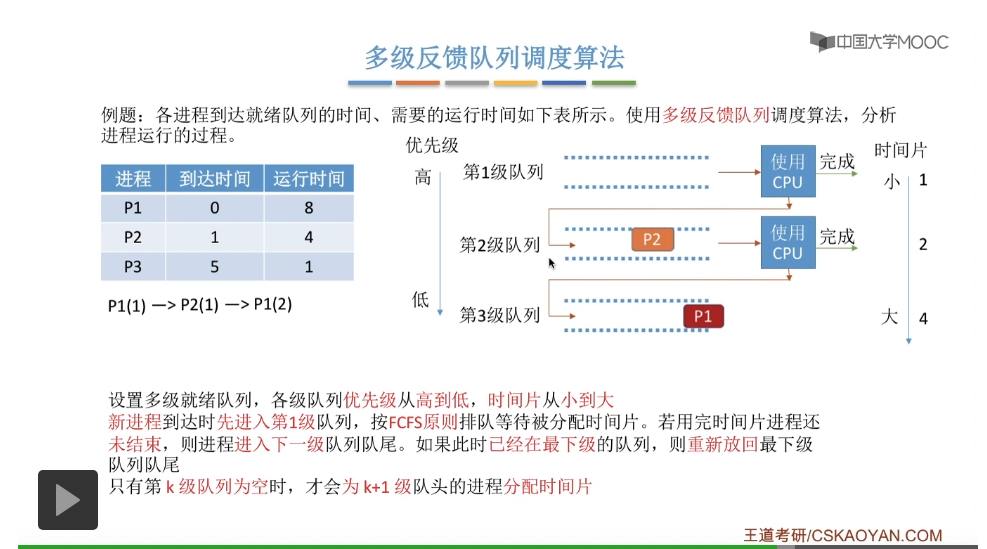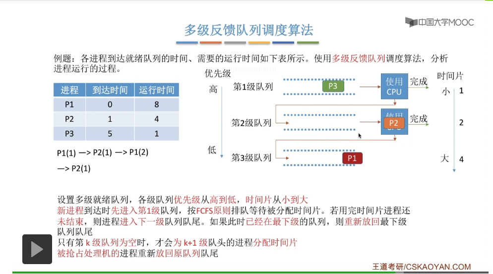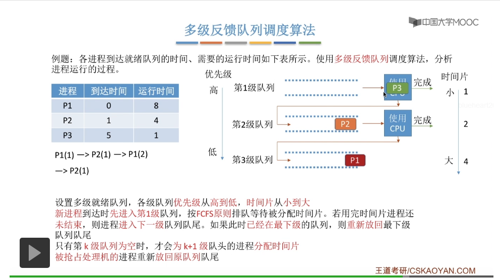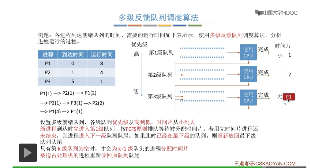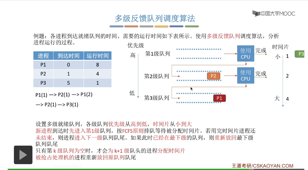 多级反馈队列调度算法的规则比较复杂,一般是用于进程调度的。多级反馈队列调度算法的抢占规则也比较复杂,虽然说它是一种抢占式的算法,但是在实际的操作系统应用当中也有可能是把它实现为非抢占式的版本。但是考试的时候咱们就以汤子赢的教材为准,认为它是抢占式的算法,并且注意一下它在抢占的时候会发生什么事情。