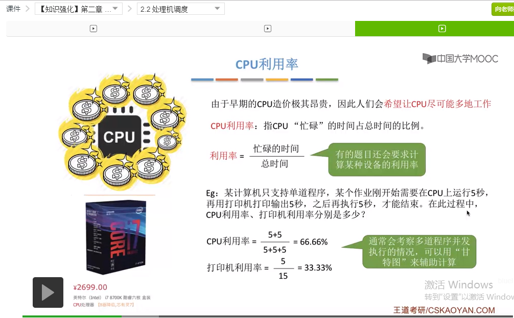 首先来看一下什么是CPU利用率,其实在早期的计算机当中,计算机的造价是很昂贵的,特别是CPU这个部件的造价占了很大一部分。它的这个东西基本就是用钱堆出来的一个很奢侈的东西,并且在现代的这些计算机当中其实CPU也不便宜,所以因为CPU这么贵,那么人们就会希望让CPU尽可能多地为人们工作,所以就设计了一个叫做CPU利用率的这样一个指标。这个指标就是用来表示CPU处于忙碌的时间占总时间的比例。那么这个利用率,就可以用忙碌的时间比上总时间就可以算出这个利用率。但是有的题目它不仅仅是会让我们算CPU利用率,还会让我们算某种比如说某种I/O设备的利用率。比如说如果一个计算机当中,它只支持单道程序,然后有一个作业刚开始的时候需要在CPU运行5秒,然后打印输出5秒之后再执行5秒然后就结束。那么在这个过程中CPU利用率就是先刚开始运行了5秒,然后之后又运行了5秒,总共运行了10秒。CPU处于忙碌的时间是10秒,然后整个过程处理的时间是5+5+5也就是15秒,那么就是66.66%将近是这样子。然后打印机的利用率的话就是打印机处于忙碌的时间也就是5秒,再比上总时间那么就是33.33%,大概是这样。但是在真正的考研题目当中通常会考察多道程序并发执行的情况,这种情况下大家可以用甘特图来辅助计算。这个地方先不展开,在课后习题会有遇到,并且也会有相应的讲解。